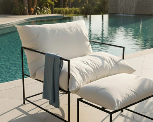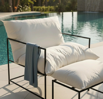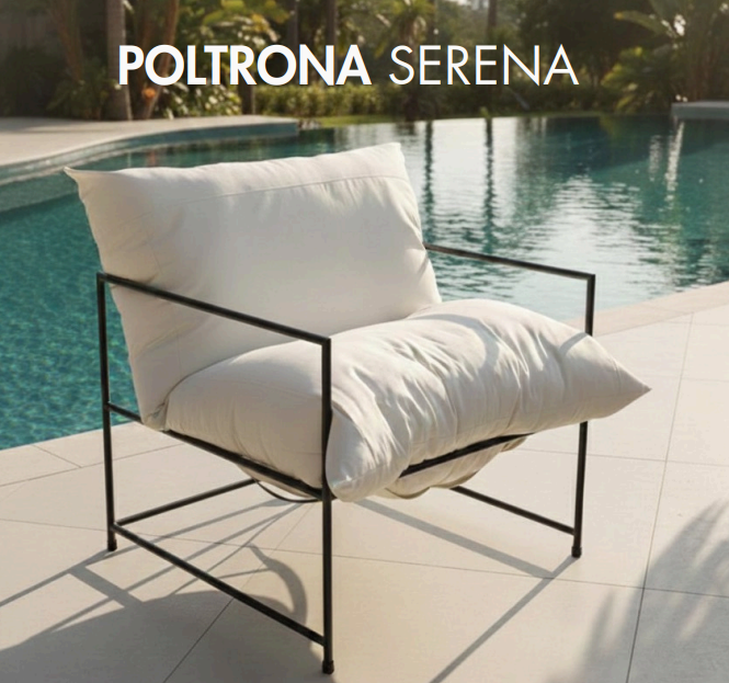 Poltrona Serena combina estilo industrial e maciez extrema. Revestida em tecido hidrorrepelente, é ideal para áreas internas e externas, resistente ao sol e à água, sem abrir mão do conforto e do design sofisticado.